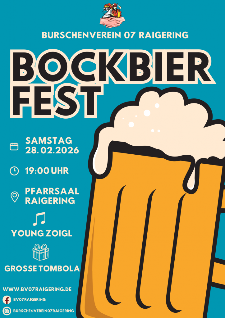 Am Samstag, den 04. Februar 2026, veranstaltet der Burschenverein 07 Raigering wieder sein traditionelles Bockbierfest im Pfarrsaal.